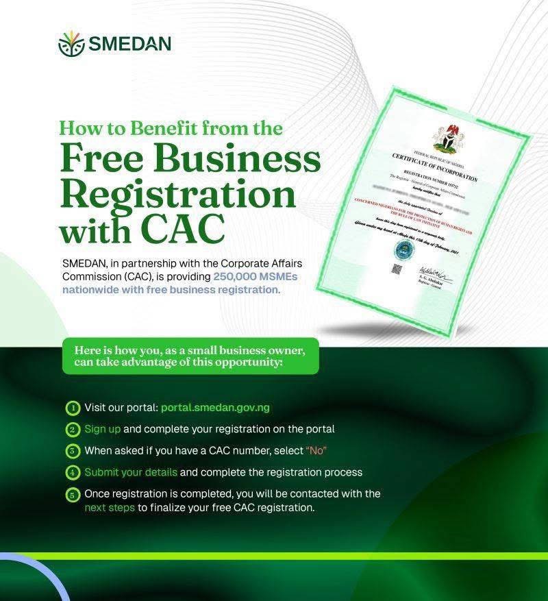 SMEDAN Begins Issuing CAC Certificate To Free CAC Business Name Applicants – Recalled that in 2025, SMEDAN signed a partnership agreement with the Corporate Affairs Commission CACNigeria to give 250,000 small businesses free registration of their business names.